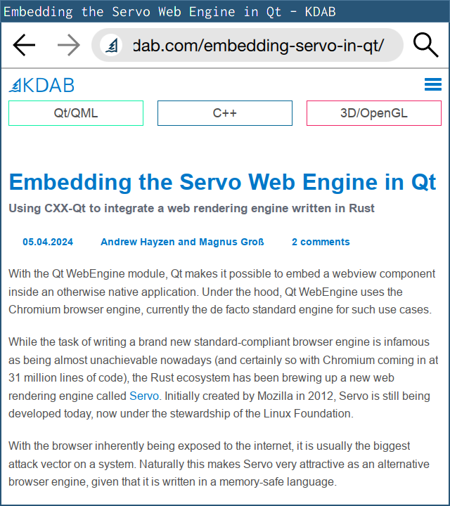 A prototype for integrating Servo with Qt was built by @ahayzen-kdab and @vimpostor and shown at Embedded World 2024. We’re looking forward to incorporating their feedback from this to improve Servo’s embedding API. For more details, check out their GitHub repo and Embedding the Servo Web Engine in Qt.