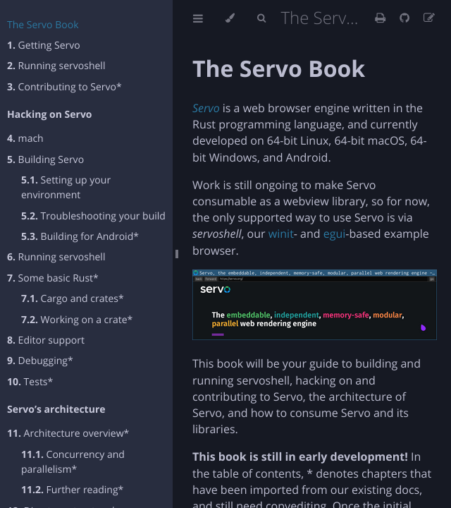 Servo’s docs are moving to the Servo book, and a very early version of this is now online (@delan, servo/book)! The goal is to unify our many sources of documentation, including the hacking quickstart guide, building Servo page, Servo design page, and other in-tree docs and wiki pages, into a book that’s richer and easier to search and navigate.