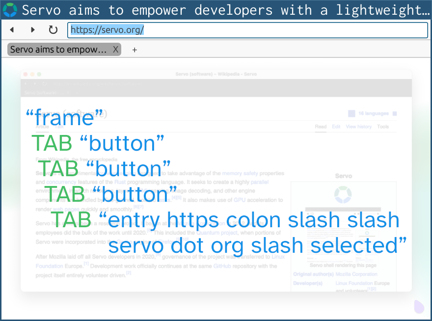 You can now use a screen reader to help you control servoshell’s browser UI (@jdm, #37519). Note that Servo’s webviews are not yet accessible to screen readers.